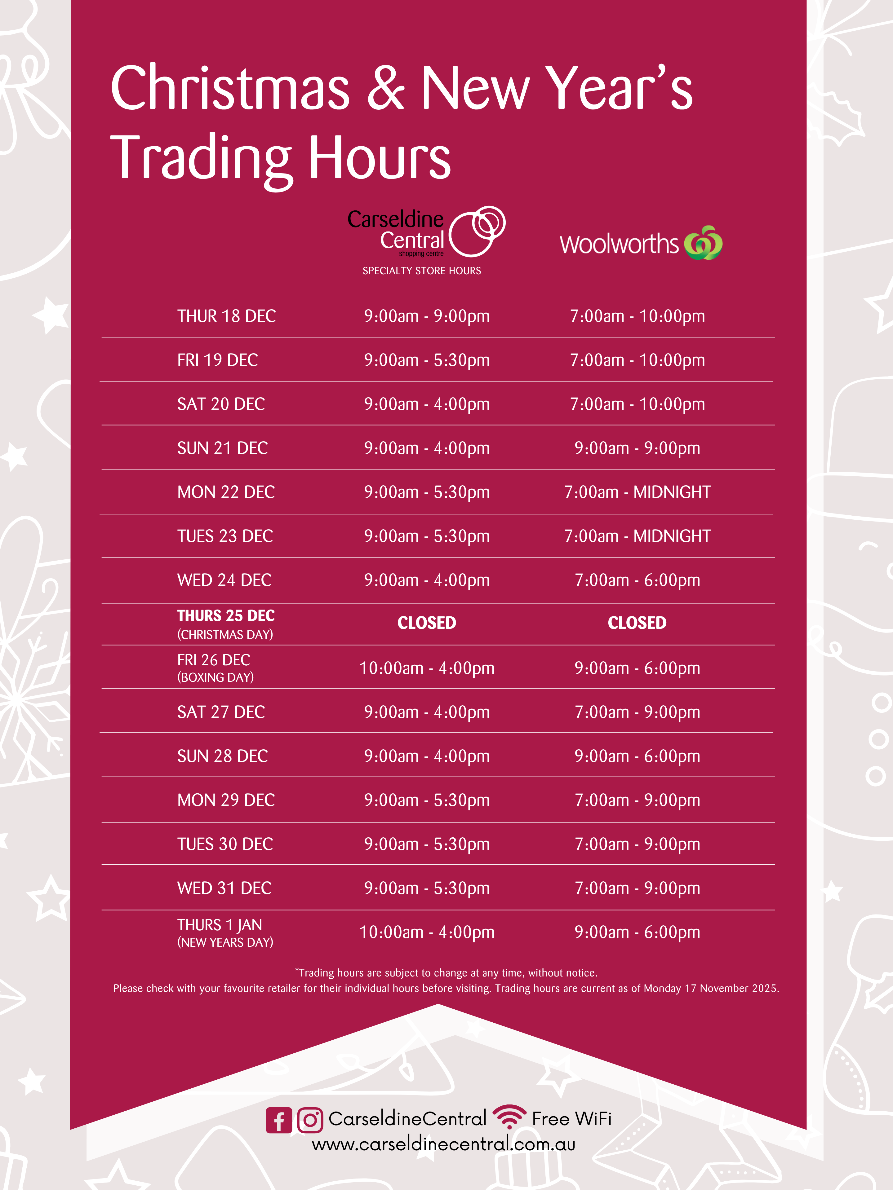 Get ready for the festive season by using our trading hours to plan your Christmas shopping so you don’t get caught out!